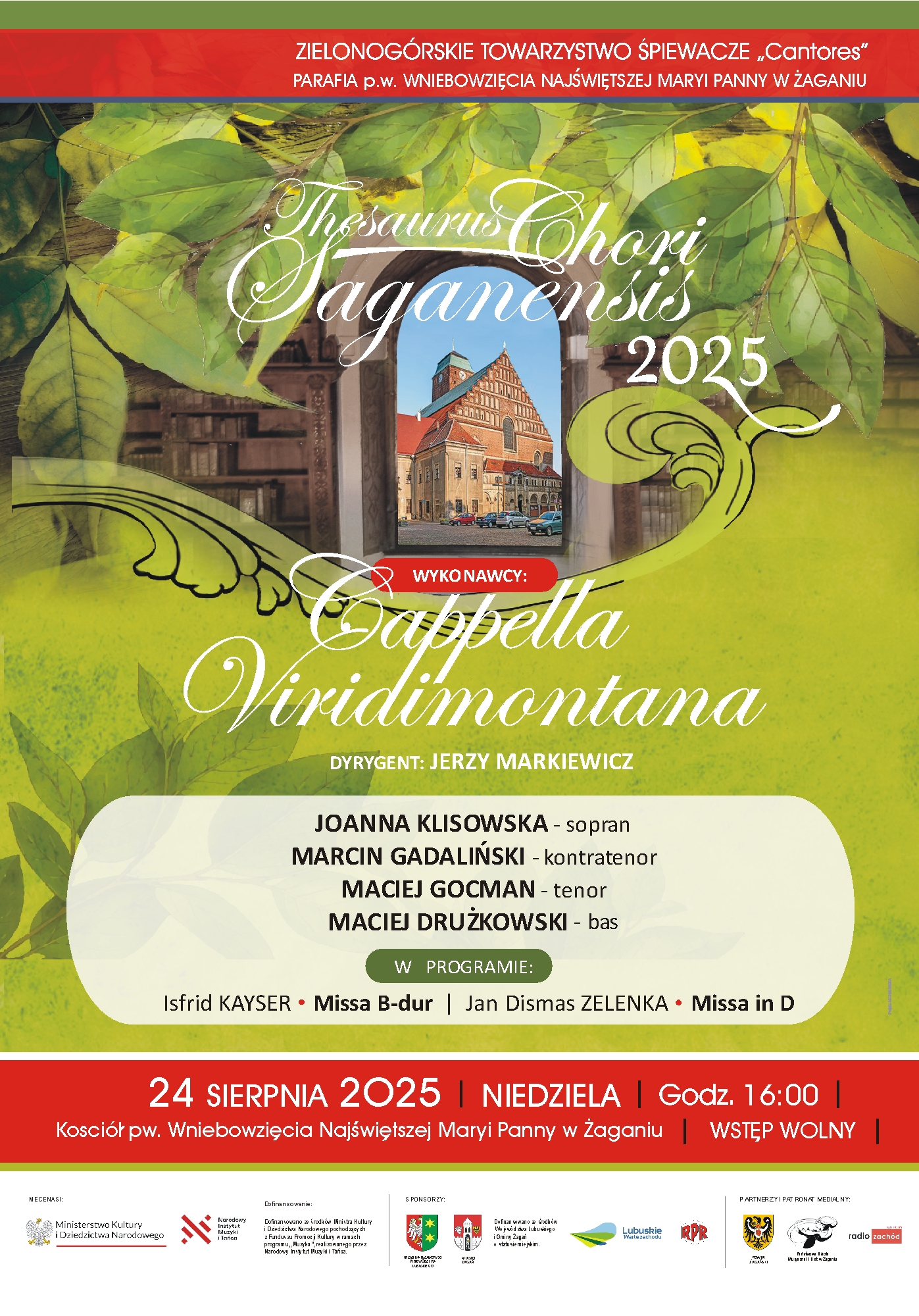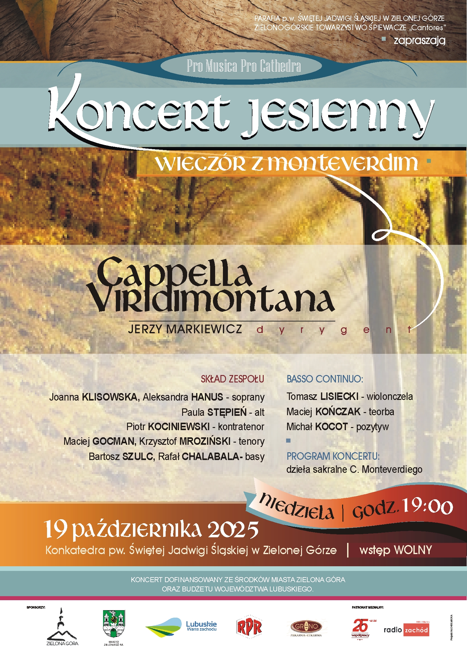 Konkatedra św. Jadwigi w Zielonej Górze pl. Wilhelma Pluty, Zielona GóraParafia p.w. Świętej Jadwigi Śląskiej w Zielonej Górze Zielonogórskie Towarzystwo Śpiewacze „Cantores” zapraszają na Pro Musica Pro Cathedra Koncert Jesienny Wieczór z Monteverdim w dniu 19 października 2025, niedziela, godz. 18.00 (wstęp wolny) Capella Viridimontana Dyrygent: Jerzy MARKIEWICZ Skład zespołu: Joanna KLISOWSKA, Aleksanda HANUS - soprany Paula STĘPIEŃ - alt Maciej GOCMAN, Krzysztof...